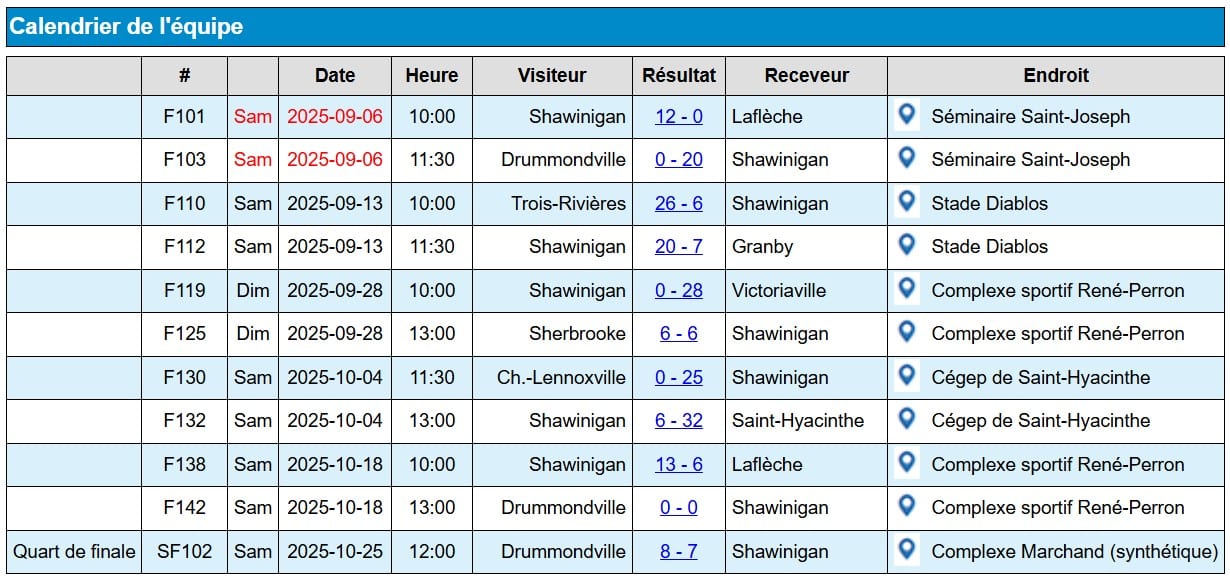 Classement, calendrier et résultats sur le site du RSEQ (flag football féminin).