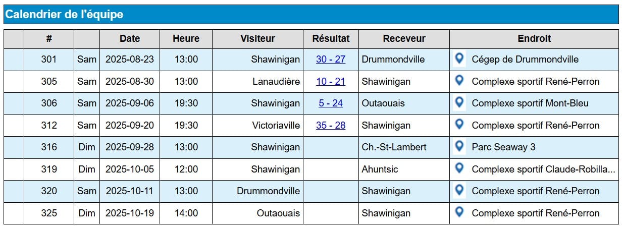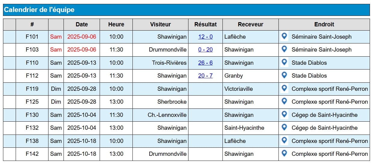 Classement, calendrier et résultats sur le site du RSEQ (flag football féminin).
