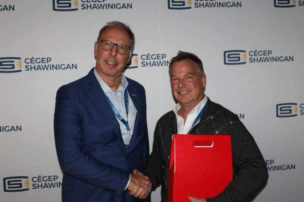 Cette photo a été prise lors du Gala reconnaissance organisé pour le Colloque. À gauche, Claude Frigon, directeur de la formation continue et des services aux entreprises du Cégep de Shawinigan. À droite, le Dr François Parent, Directeur médical régional des SPU du CIUSSS MCQ, urgentologue, enseignant à l’Université de Montréal et médecin en chef des Jeux du Québec – Trois-Rivières 2025.